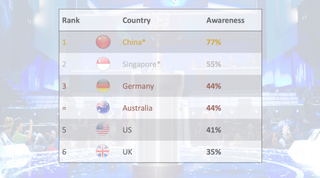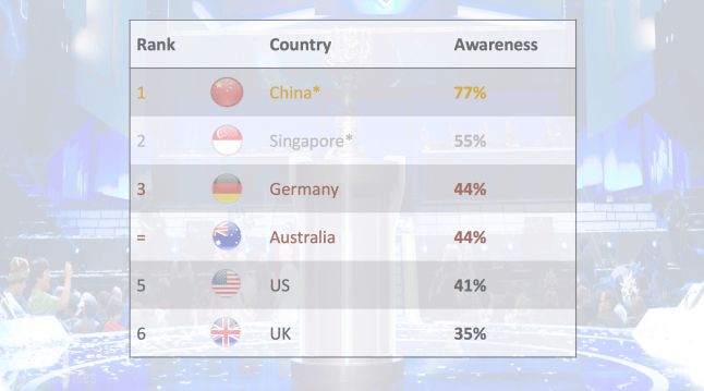 As the table below shows, the UK is currently below every other nation featured in the study when it comes to awareness, with China and Singapore leading the charge by some distance.