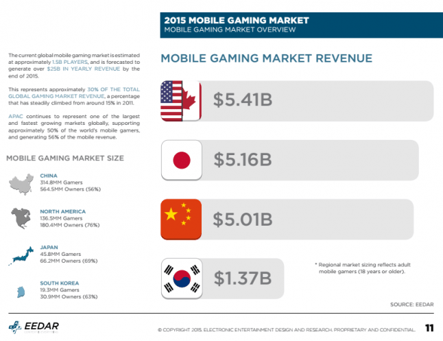 According to a new report by video game research outfit EEDAR, the mobile game market will have generated over $25 billion in yearly revenue by the end of 2015, with over half of that coming out of the Asia Pacific (APAC) region.