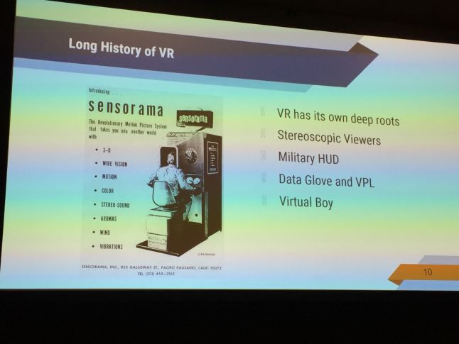 Falstein briefly went over humankind’s quest to share images, using the example of a 20,000-year-old cave painting. “Our ancestors have been struggling with this for a long time,” he said—the desire to convey something one might personally see to other people. From cave paintings to camcorders, to smartphones with advanced cameras, to VR today, humans have been trying all kinds of ways to convey images that inform or evoke emotions in other people.