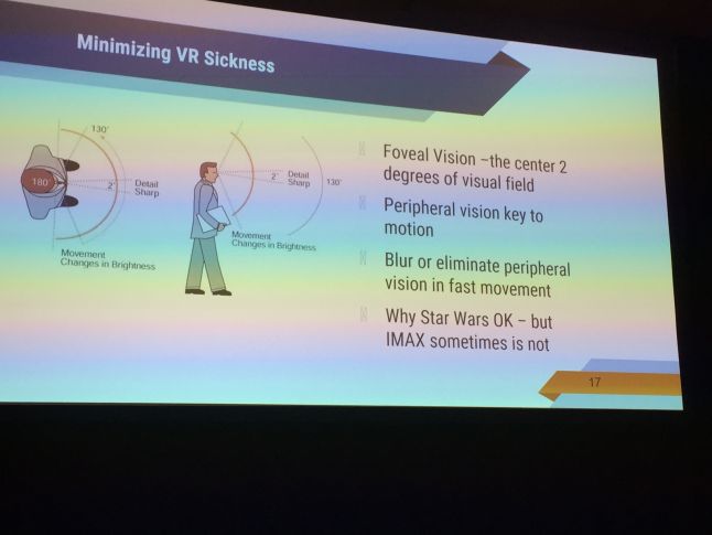He also explained how blurring or eliminating peripheral vision during acceleration can help fight motion sickness. Some games and Google Earth in VR use this method, and as eye tracking systems become more advanced, users will have more comfortable VR experiences, he said.