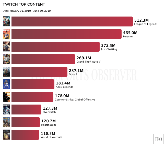 The full report on The Esports Observer lays out details on the viewership for the top games of the year so far on Twitch, offering game developers a look at how trends have shifted both in the first half of this year, and compared to 2018’s final numbers.