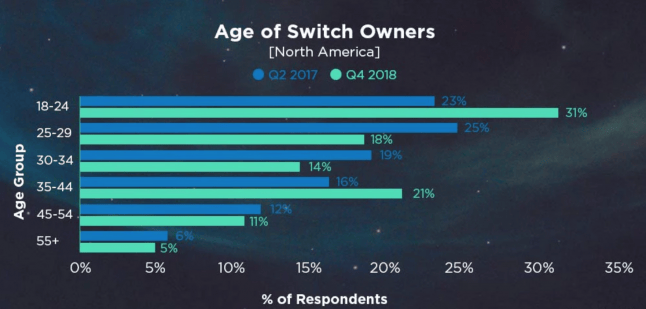Ages for initial Switch owners leaned towards those in their mid-twenties to mid-thirties before demographics began to skew both younger and older, implying that families and younger people were not as quick to adopt the console right away.